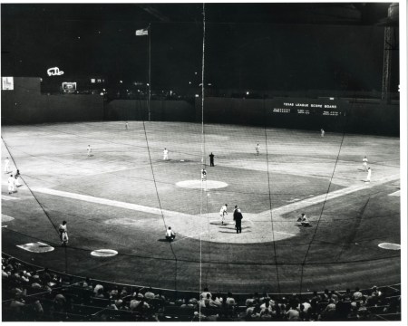 By 1938, Buff Stadium fence distances had crept even higher to 340 feet in center and 345 feet down the lines. After World War II, new President Allen Russell quietly adjusted things to the needs of power hitters like Jerry Witte and Larry Miggins. Right field in this photo is only 325 feet from home. The same distance to left was shortened to 330 feet. Center settled in to about 424 feet. They could have come in closer down the middle, but nobody wanted to lose the flagpole from the playing area in center field.