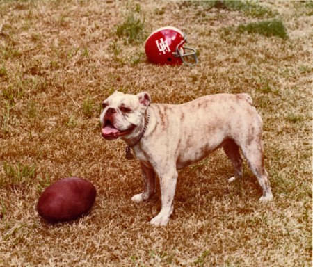As the best laid plans of mice and men so often unfold, things didn’t happen the way I hoped they would. UH ran off an 11-1 season in 1979 that included a 17-14 win over Nebraska in the Cotton Bowl and a #4 finish in the final AP Top 25 Poll, but the university dropped the ball in the way they decided to handle this incredible success: (1) The Retirement of Jersey #1 for the fans never happened. When linebacker Brabham went out with an injury early in the 1979 season, he applied and received permission for another year of eligibility in 1980. The retirement ceremony was postponed, but still never happened because the importance of the event was not communicated to the football coaching staff – who promptly promised the #1 to another recruit. And that was that. (2) Mad Dog Babe had become a darling of the fans, but the presence of the feisty and talented bulldog on the field had aroused some jealousy among members of the Cougar Guard students who took care of Shasta, the live Cougar, on the sidelines. There wasn’t much they could do with Shasta, who came to each game under heavy sedation for the safety of one and all. Meanwhile, the Mad Dog Babe was roaming the sidelines, tearing up jerseys and replicas of the opposition’s mascots and leading the Cougar defense on the field prior to games. As her owner, trainer, and good buddy in ridiculous mayhem, I got to be there with her for every game, even getting to kick a 35 yard field goal in an after midnight half time ceremony in a game with Texas A&M that had to be postponed until later in the evening due to a baseball playoff game between the Astros and Phillies back in 1980. It was simply a wonderful time for the two years (1979-80) that it lasted.