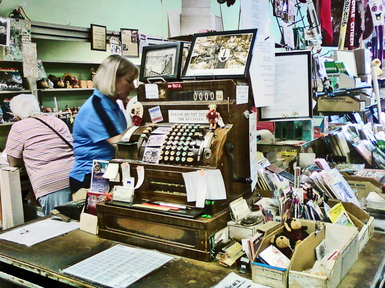 When your shopping is done, the family will ring up your sale at this classic cash register. You will get a written receipt from a handy nearby adding machine. That's Benny's daughter and store owner Cathy Irby in blue ringing up a customer as this photo was taken, as were all others here, on June 29th.