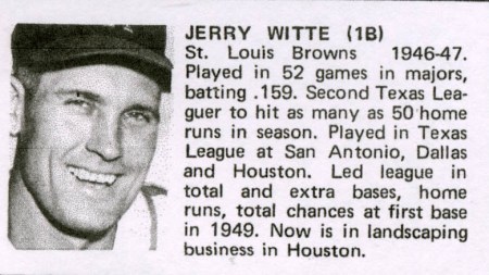 Jerry Witte once told me that Roy Campanella remembered him as a post World War II opponent in the American Association during the 1948 short time that their paths crossed as players for Louisville and St. Paul. “I remember you from Louisville,” Campy told Jerry when they met again at the 1959 Astrodome Old Timers Game.. “You were the guy who always came to the plate stomping bugs in the dirt with the business side of his bat.”