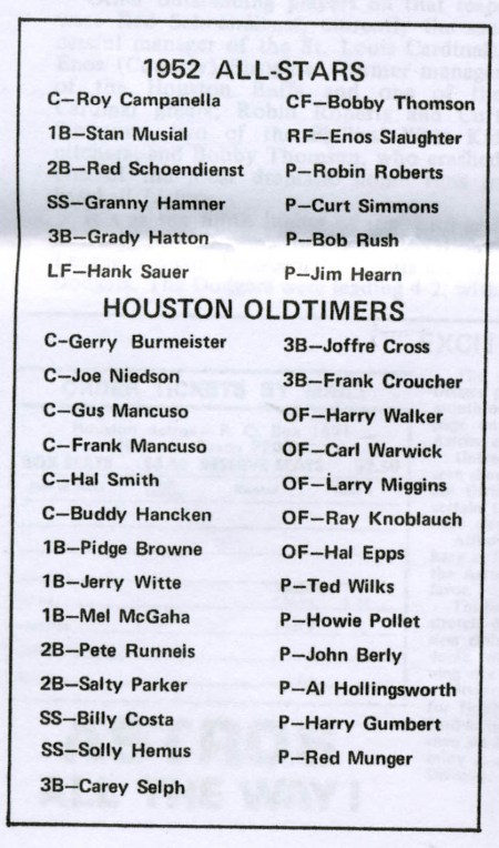 How do you top that 1968 lineup? Well, maybe you don’t, but the 1969 Astrodome All Star Old-Timers’ Game wasn’t exactly chopped liver. In a game that pitted the Houston Old-Timers against MLB Stars from the 1952 National League All Star Team, Stan Musial and Roy Campanella shone pretty bright in their own realms. Here’s how those rosters appeared on the front page of Old-Timers’ Day, a September 1, 1969 publication of the Houston Sports Association: