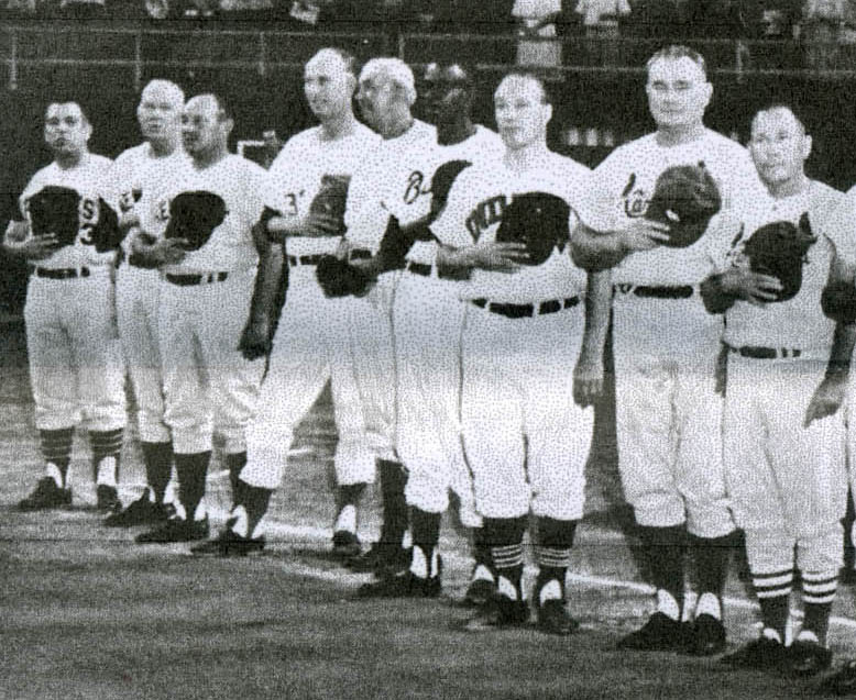 Left Side: Bobby Bragan, Bill Dickey, Allie Reynolds, Ewell Blackwell, Monty Stratton, Satchel Paige, Bob Feller, Johnny Mize, & Solly Hemus.