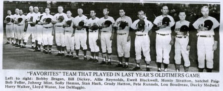 My brother and I were with my dad at that 1968 Old Timers game. Field boxes, front row on the first base line. Joe DiMaggio hit a foul ball pitched by Satchel Paige, toward 1st base. Dad leaned over to try and catch it, but it bounced off his glove and fell to the ground.