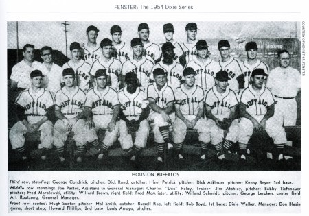 All I will say is that the ’54 Buffs took my heart with them in that collapse. My three favorite players that year were an earlier version of the “Killer B’s” – 1st Baseman Bob Boyd (.321 BA, 7 HR, 63 RBI), 3rd Baseman Ken Boyer (.319 BA, 21 HR, 116 RBI), shortstop Don Blasingame (.315 BA, 5 HR, 53 RBI) and right fielder Willard Brown (.314 BA, 35 HR, 120 RBI). Brown got a lot of numbers with Dallas before coming over to Houston, but he proved to be the big difference-maker for Houston in the stretch. The best pitchers for the ’54 Buffs included WIllard Schmidt (18-5, 3.69 ERA), Hisel Patrick (10-3, 3.77 ERA), Luis Arroyo (8-3, 2.35 ERA), and Hugh Sooter (14-13, 3.28 ERA).