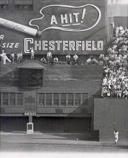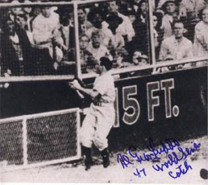 DiMaggio launches a blast that seems destined to reach the stands at the 415 feet mark, but late inning substitute left fielder Al Gionfriddo, all 5’6″ of him, races far across the field to reach over the fence and make the catch, denying Joe and the Yankees a game-tying homer at the 415 feet sign. The Dogers go on to win Game Six by 8-6, but lose in Game Seven to the dynastic Yankees.