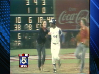 Hank Aaron finishes his most famous extra base hit in the company of the two bozos who invaded history.