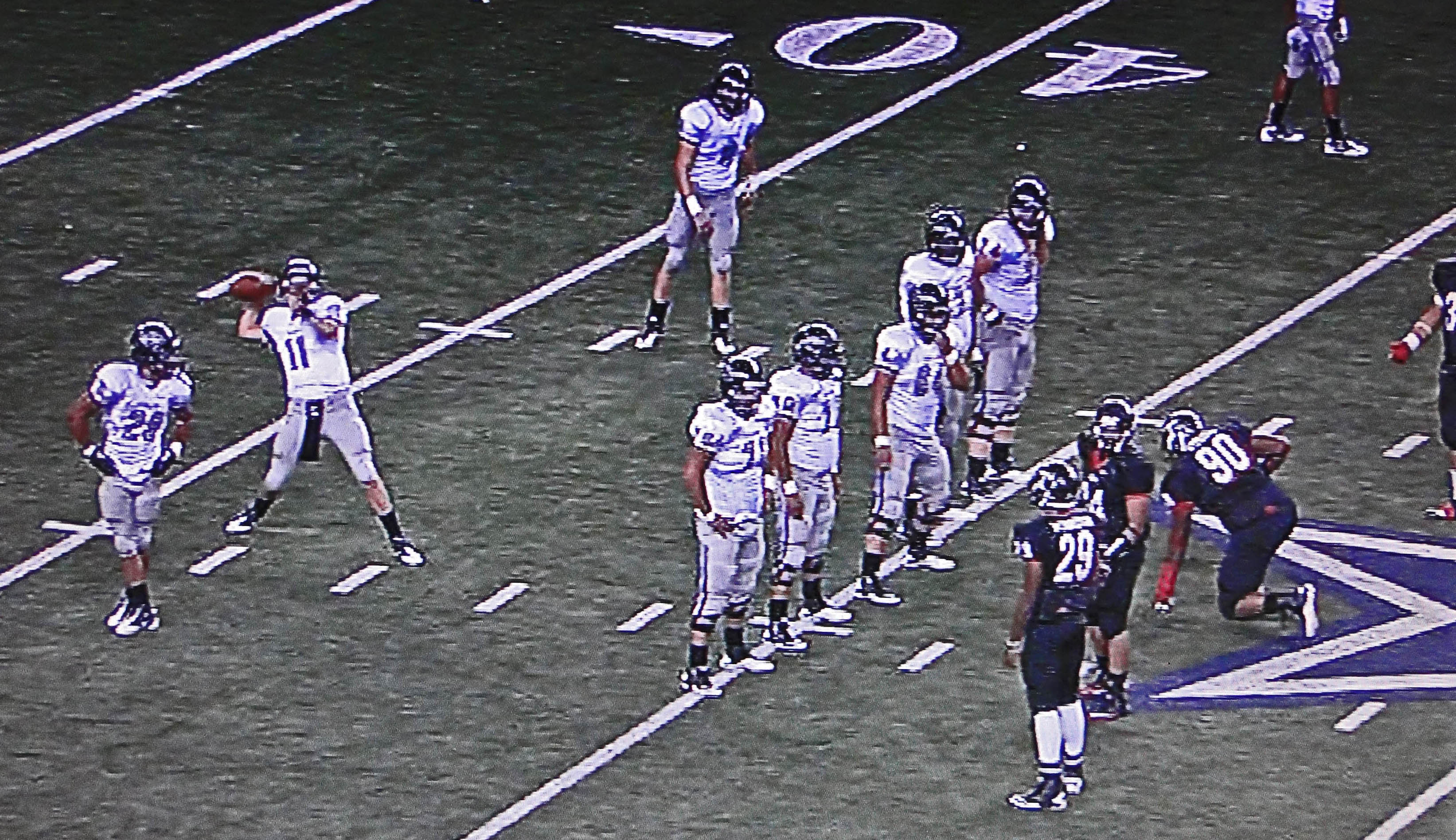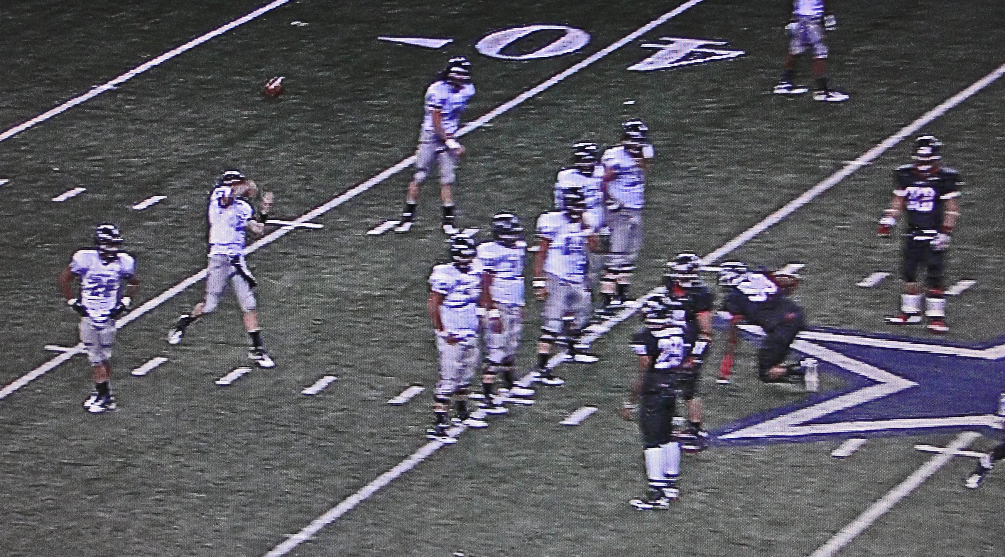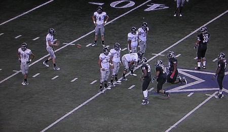 Above Photo: Pearland (in white) center Derek Hoffpauir snaps the ball to QB Trey Anderson. Receiver Sam Ukwuachu is in motion off-camera, lower left, but all other Pearland players are perfectly still. Taking their cue from the still guys, ten of the Euless Trinity defenders just stand there too. The only defender to figure it out early is the back covering Ukwuachu. He goes in motion to guard against what’s to come, but he has no help.