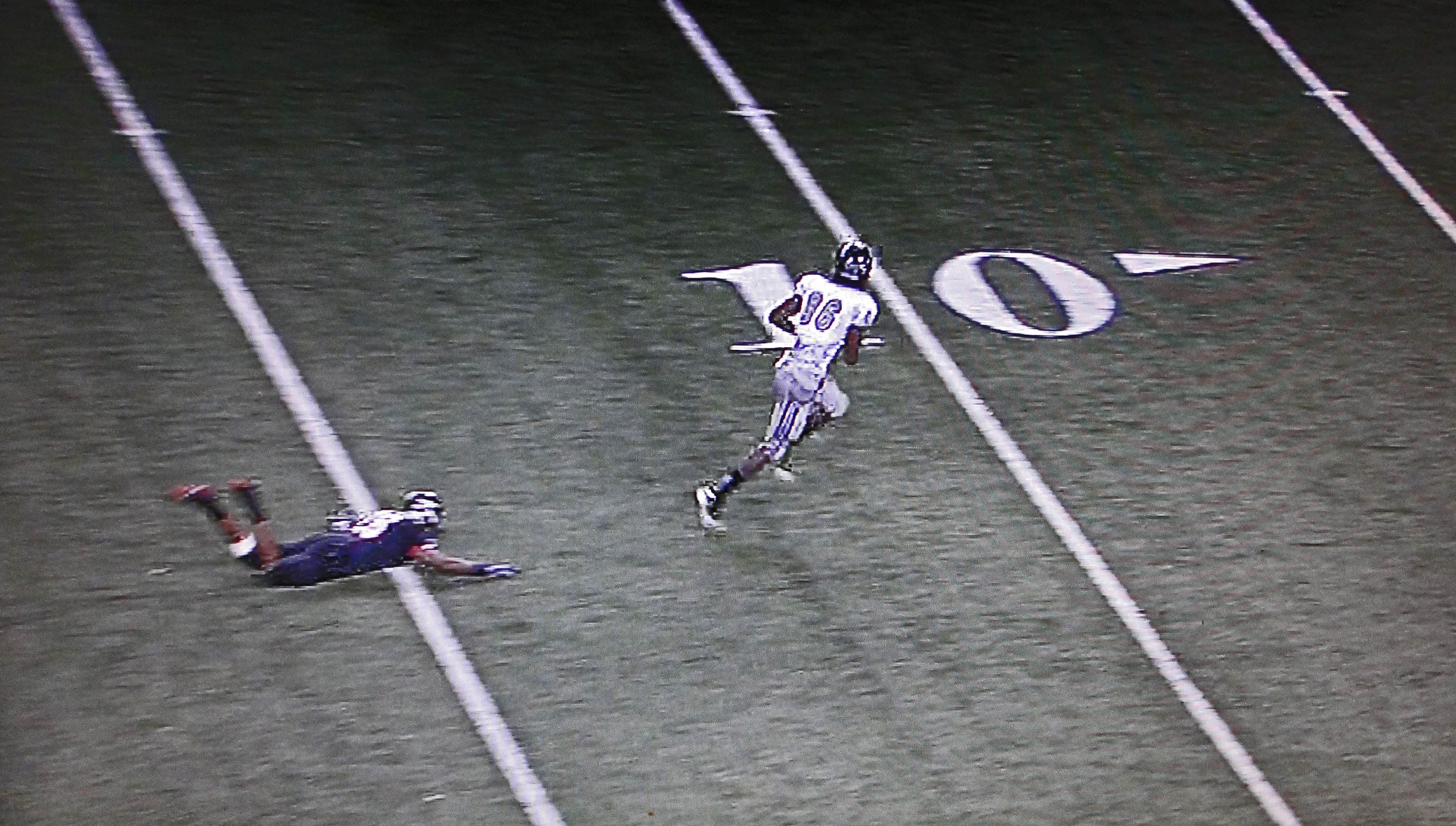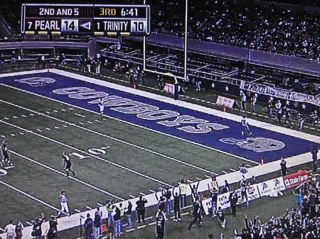 Above Photo: With 6:41 to go in the 3rd quarter, Pearland has taken a 21-10 lead. Each club will score seven points in the fourth quarter, but this play throws all the momentum behind Pearland and, as we are starting to say redundantly, it also transcends as the final difference in scoring. Euless Trinity plays well, but they get a taste of one of life’s most important crueler lessons: Sometimes life isn’t fair and things are not always what they seem. All we can do is stay alert, try to learn from our errors and disappointments, and hope we do better the next time. The same set of lessons are available to the Fox Sports Network.