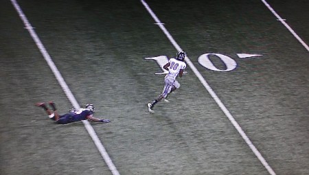 Above Photo: Pearland wide receiver slips by the lone Euless Trinity defender and prepares to glide under the catch near the 20. He will take it in fully at the 16 and waltz home home easily from there. By now, the rest of the Euless Trinity team is moving, but it is way too little and far too late for the Trojans to prevent disaster. Alarm clocks and snooze buttons are not much help in football either.