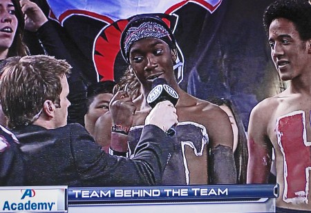 With a little less than seven minutes to go in the third quarter, and leading 14-10, Pearland was driving, with a first down on their own 46 yard line. That’s when Fox cut to the stands for a report on why certain male Euless Trinity students had decided to go shirtless and paint their chests patronizingly on the occasion of this cold weather game. (DUH, FOX! It was indoors! They’re adolescent males! What do you expect them to do, act like mature adult FOX executives? And where was all your journalistic training about story line in that director’s apparent (i.e., “Dog Bites Man = no story. Man bites dog = story.) Had they been female students doing the same thing, you might have had a shocking sideline sidebar piece, but you had nothing there in these typically adolescent young men to justify missing one of those once in a lifetime plays that hardly ever happen,