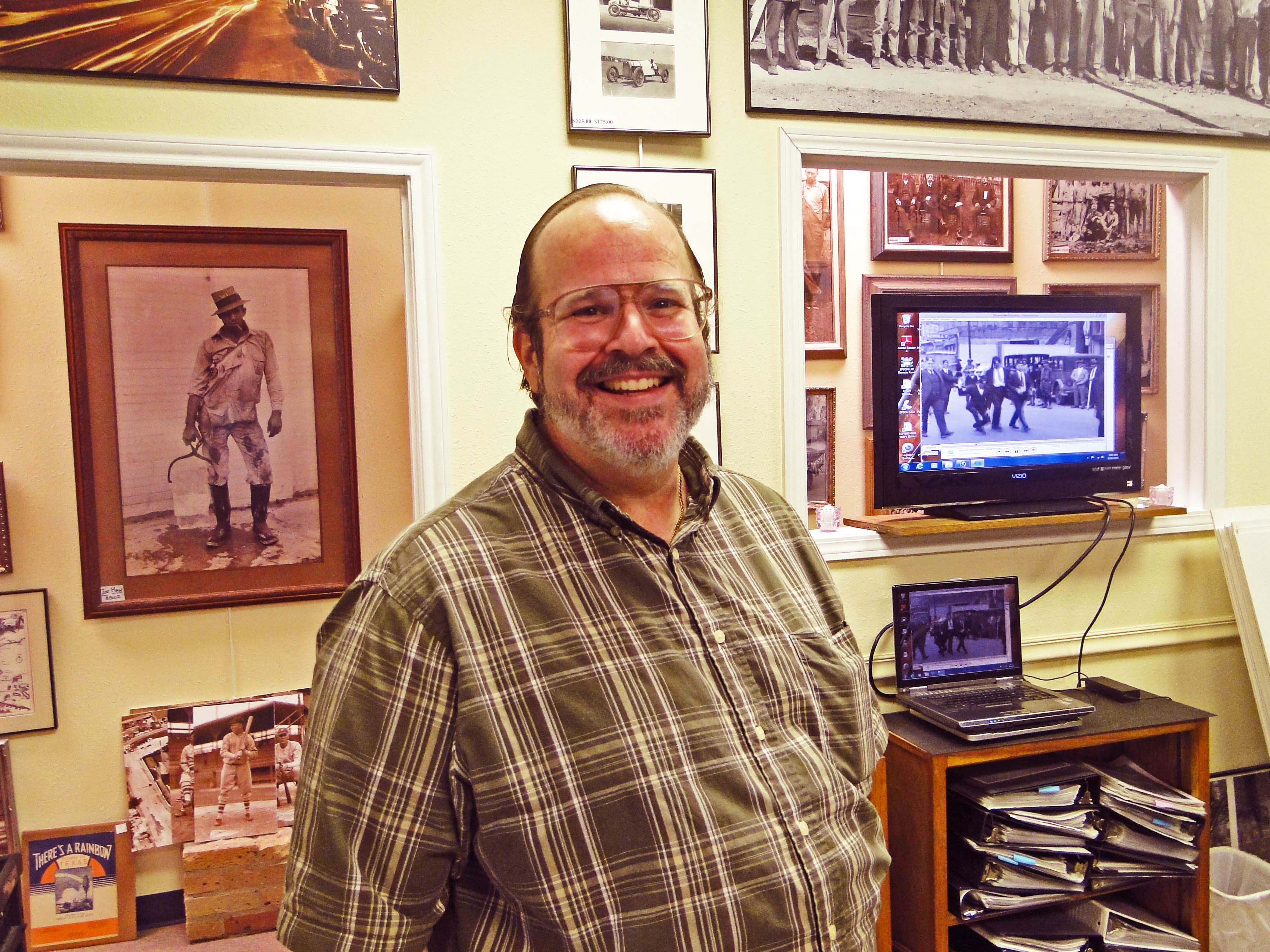 It was a natural fit. The Sloane Gallery already specializes in classic photographs of the Houston area that date back to the 19th century, but owner Story Sloane took it further on Saturday. He ran a motion picture that he had put together from clips of local events that dated back to the early decades of the 20th century – and then he wound himself into an impromptu historical narrative of what we were watching, even extending his interpretations and historical lacings to the still photographs that hang all around you normally in 360 degree fashion at the gallery.