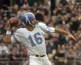 In 1962, Blanda also hit the ignominy scale by throwing a record 42 pass interceptions. It is a record that still stands and it was just the downside of Blanda’s all-out production drive that season. He also netted two 400 plus yard games in 1962 and almost led the Oilers to a third straight AFL title before the Boys in Columbia Blue fell in a double overtime title game loss at Jeppesen Stadium to the Dallas Texans.