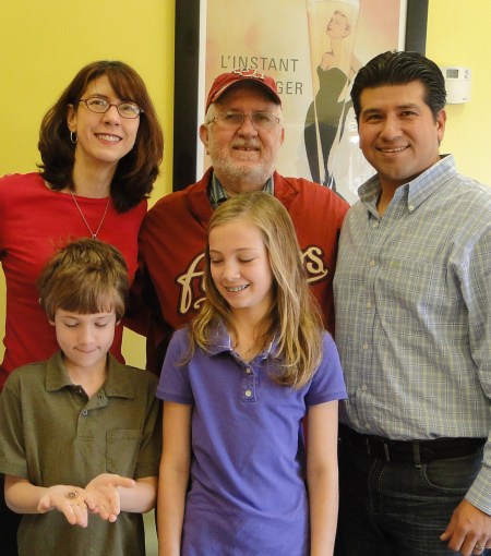 Robert Rodriguez found me through Google, connecting me to Jerry Witte through my past role as his co-author on “A Kid From St. Louis.” That connection led straightaway to the Witte family and the reclamation meeting we held yesterday at the business office of the Rodriguez family. Dr. Zita Witte and her husband, Dr. John Maxwell, had made a special trip up from Lake Jackson yesterday, along with their two children, Mary Elizabeth, age 11, and Andrew, age 9. All the Maxwells had to do was pay The Gold Rush the meltdown value of the ring to get it back.