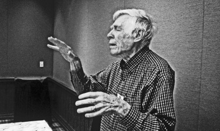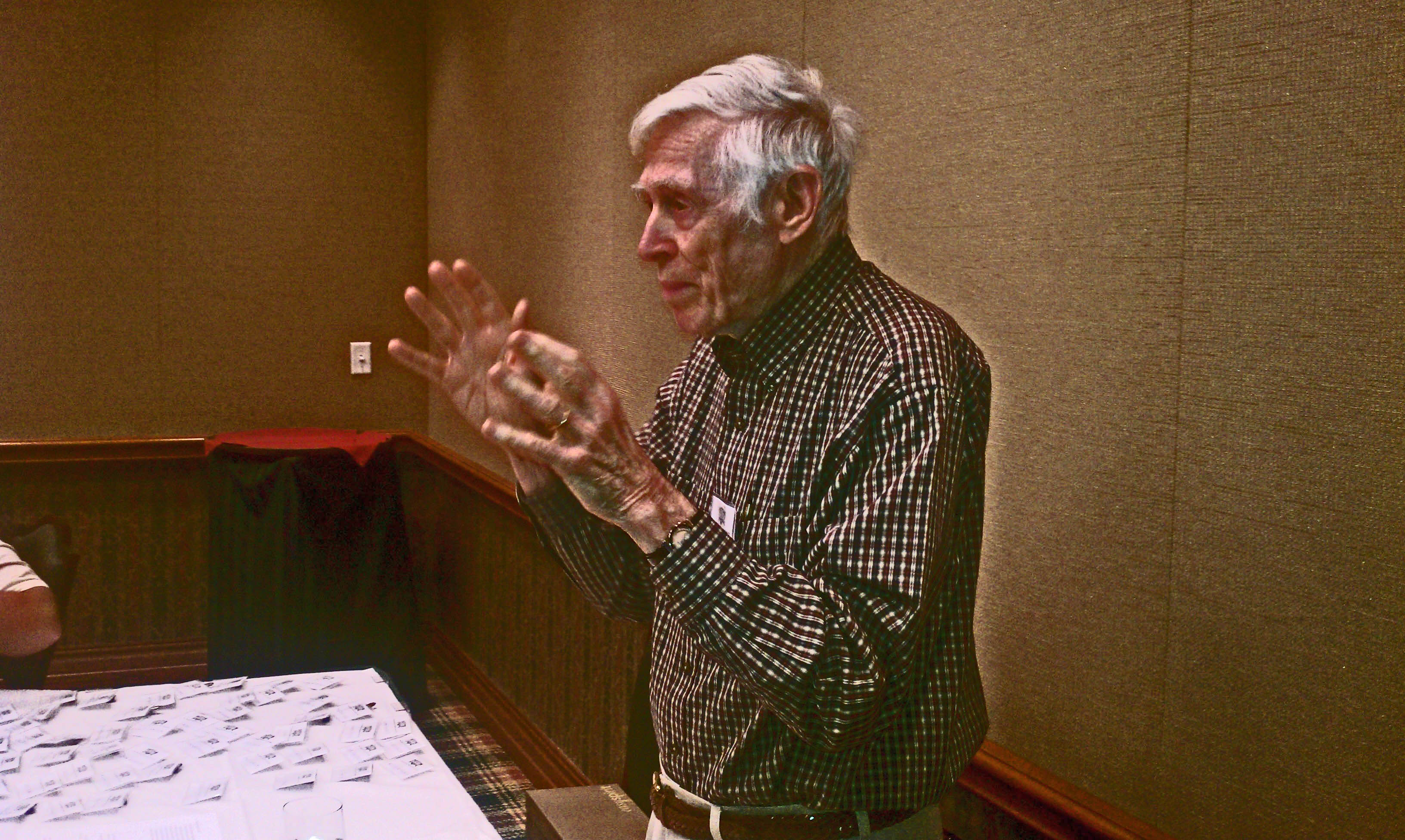 Column Addendum, 4/18/12: Here’s a better shot of Norman Macht as he personally euthanized the “Two Homers off Bobo Newsom by Joe DiMaggio in the Same Game” story for being untrue at the 4/16/12 meeting of SABR’s Larry Dierker Chapter on Monday Night at The Inn at the Ballpark next to Minute Maid Park in Houston:
