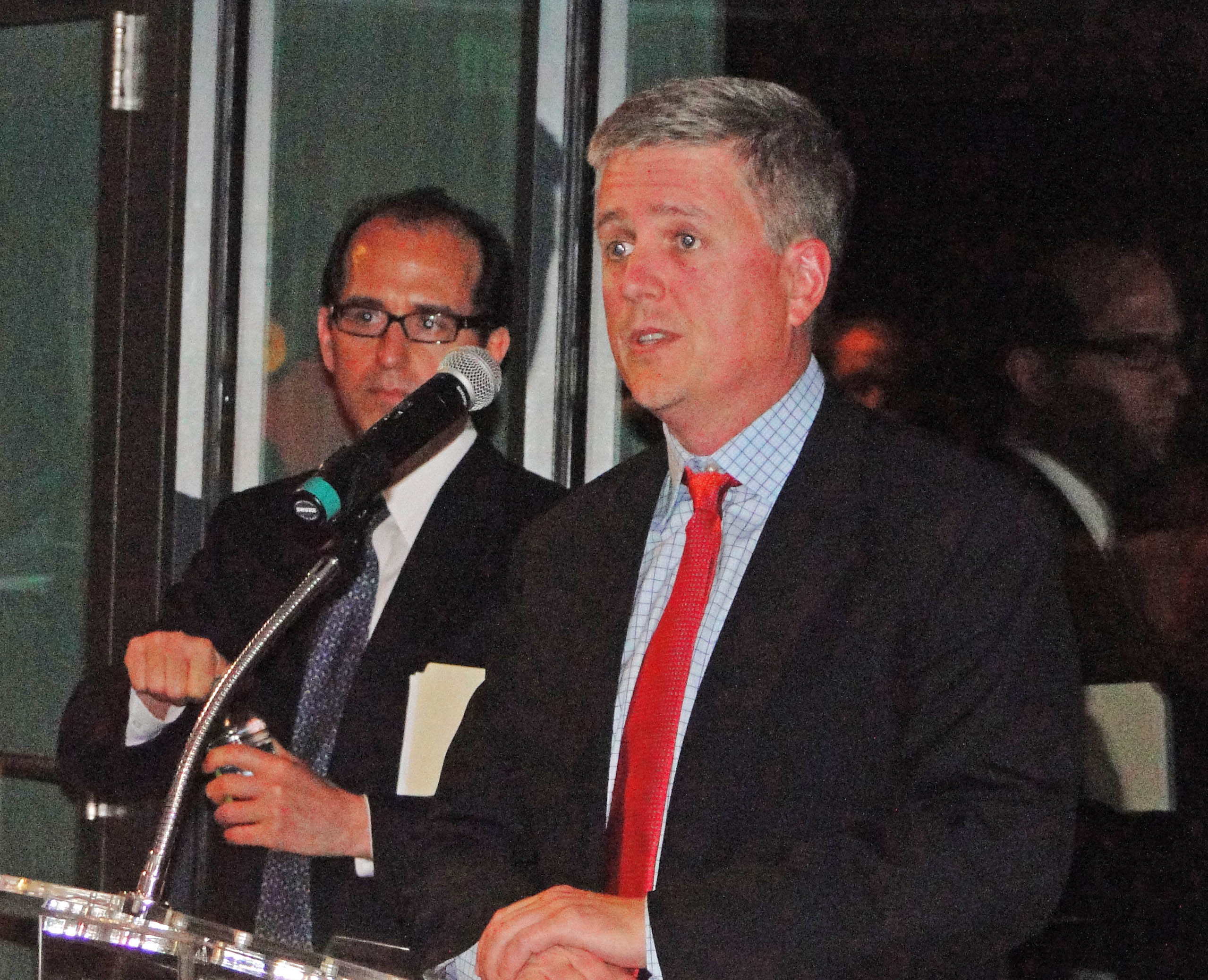 Astro President George Postolos (L) & General Manager Jeff Luhnow at Minute Maid Park (speaking), Houston, Spring of 2012.