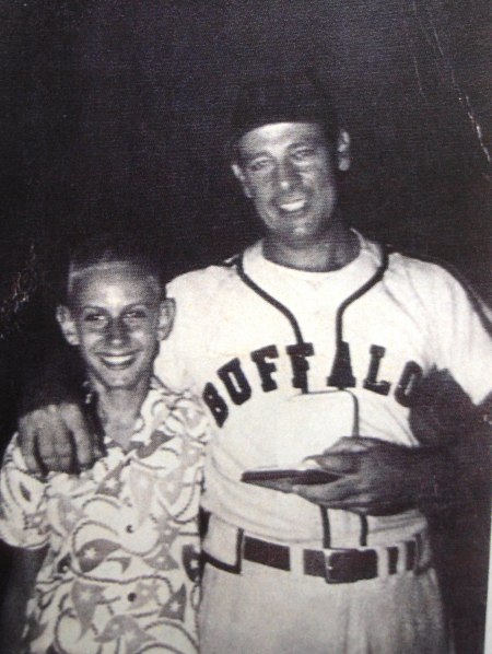 On “Knothole Gang Night,” catcher Frank Mancuso poses with one of the members as he also models the 1953 Buffs home uniform that was quite popular for several seasons in the 1950s. It resembled the home Cardinals uniform, minus their famous “Two Birds on a Bat” logo.
