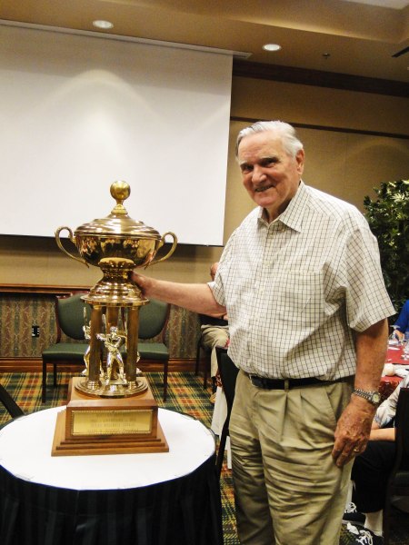 Larry Miggins hit 28 home runs for the 1951 Texas League champion Houston Buffs. Here he stands by the 1951 pennant trophy that was awarded to the Buffs, but was en route from Jo Russell to Mike McCroskey last night night for storage.