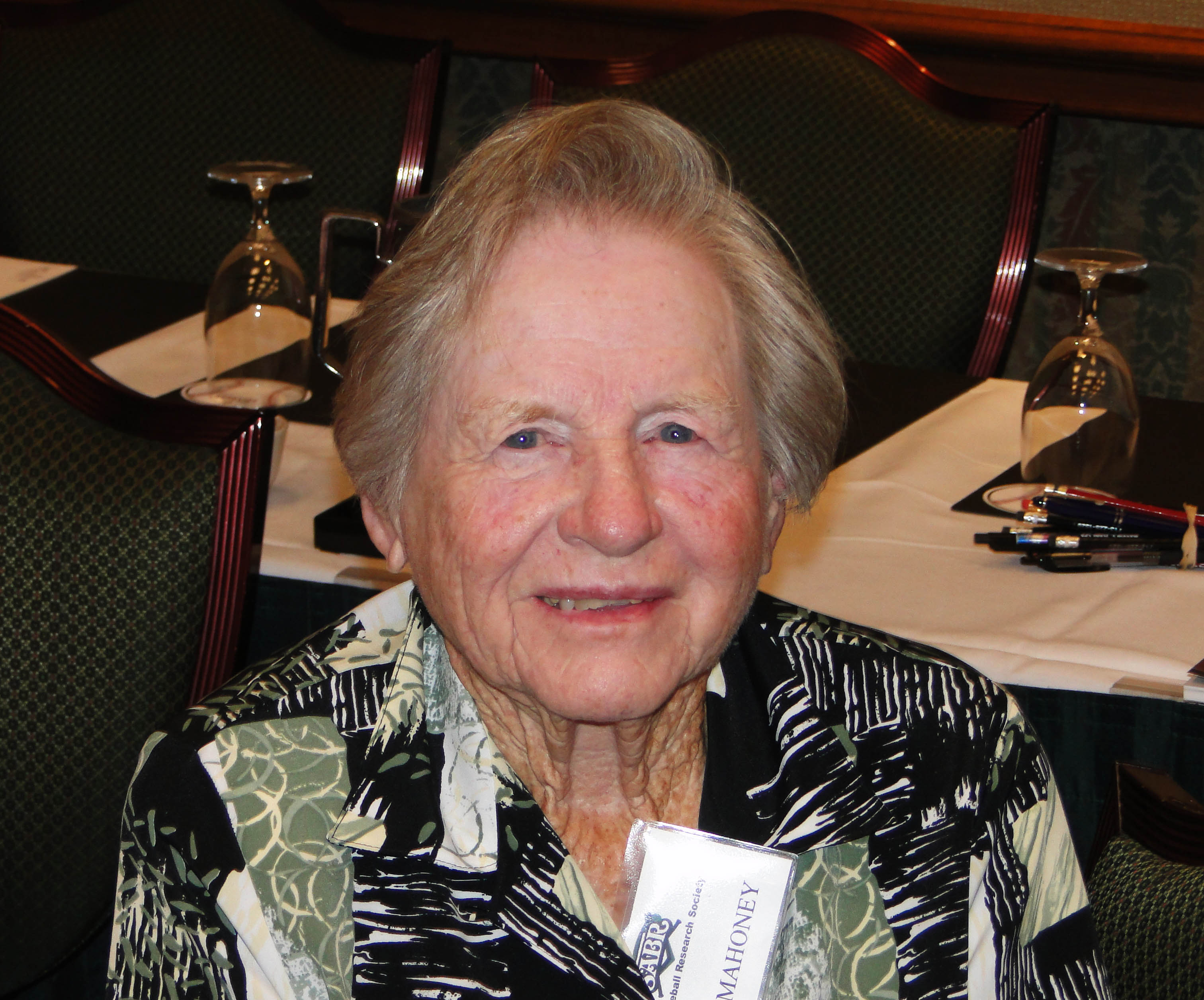 Marie “Red” Mahoney of Houston is a veteran all-star outfielder who once played ball for the Soth Bend Blue Sox and Fort Wayne Daisies in the All American Girls Professional Baseball League. Red Mahoney and deceased fellow Texans Alva Jo Fischer and Ruth Lessing were the first women inducted into the Texas Baseball Hall of Fame in 2006. She was presented last nigh by SABR-Houston member and early Houston baseball researcher Marsha Franty.