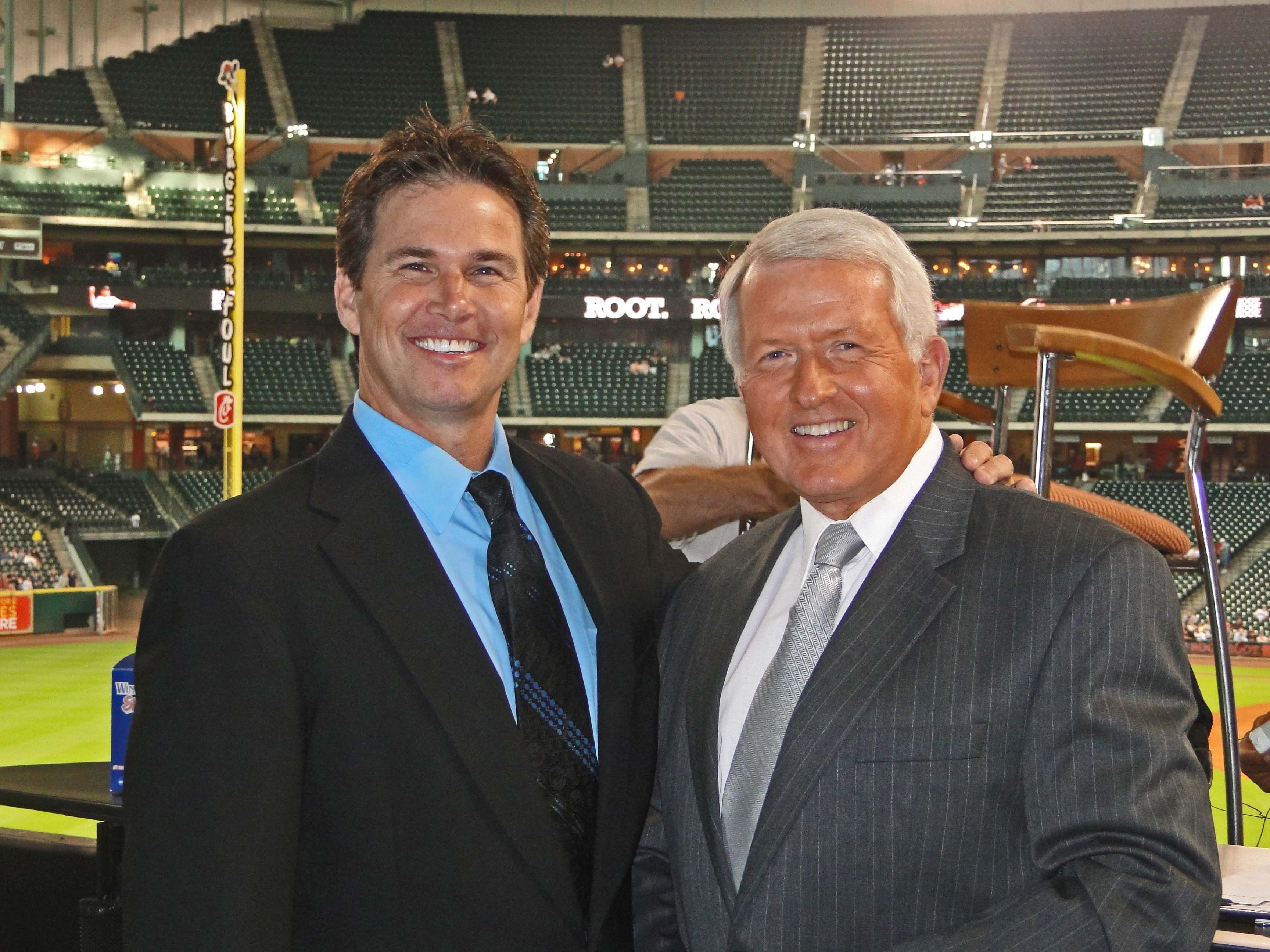 Greg Lucas (R) with current commenting partner Steve Sparks on the last night of the Astros home schedule, 9/26/12, as pre and post game analysts. Lucas has been the multiple seasons media partner to many others, including Kevin Eschenfelder, Art Howe, Jimmy Wynn, and Allison Footer, among others, in addition to his on the field and spot work as a live broadcaster of Astros games on both television and radio. The absence of Greg Lucas from the new network plan that starts in 2013 shall be felt by Astros fans everywhere.
