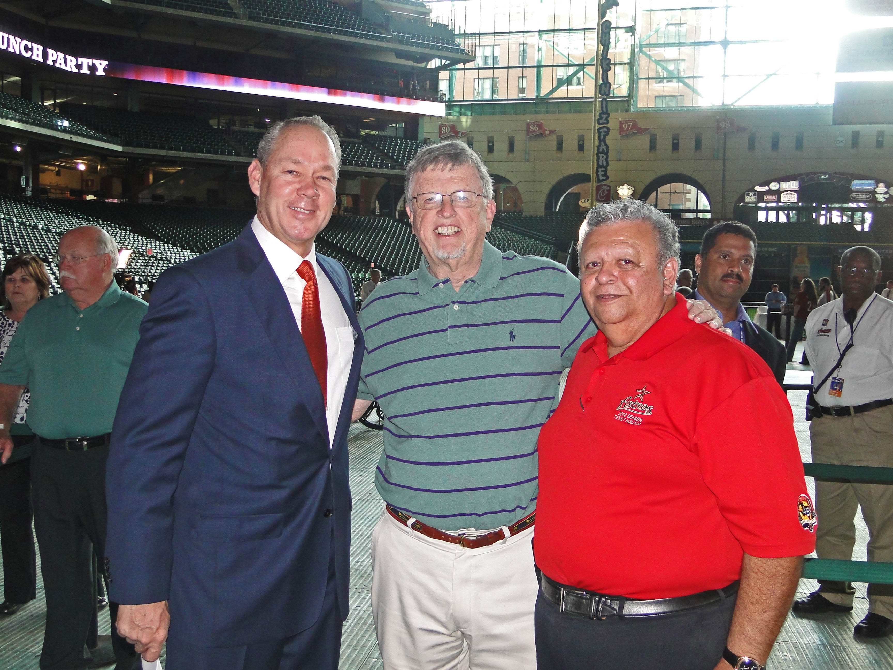 Astros Owner Jim Crane (L) with season ticket holders and SABR members, Bob Dorrill and Sam Quintero. (Note: A portion of the notorious signs is visible in the far upper right hand corner.)