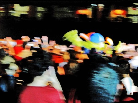 Orbit is back as the 2013 Houston Astros mascot. He arrived by limo and quickly made a stage appearance that defied the photo-taking efforts of yours truly and the other Astros-Papparazzi. Orbit’s blurring run to the stage reduced photography to an episode in the art of digital color spreading. If you examine the above carefully, you will find parts of Orbit, running from right to left.