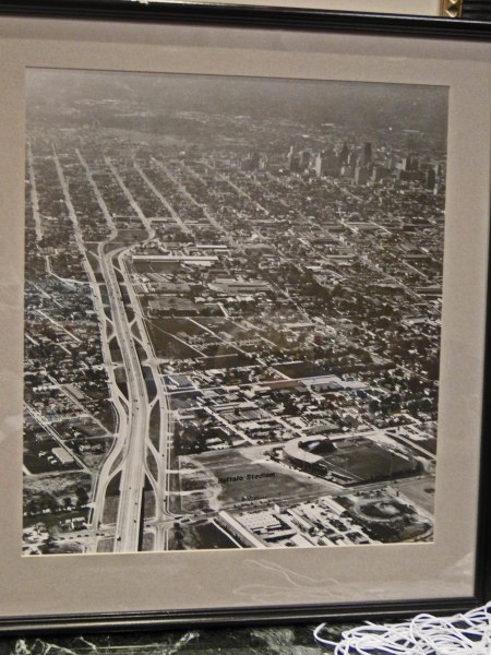 Jo Russell brought a framed aerial photo of Buff Stadium, looking west toward downtown from the Gulf Freeway. It was done by the Bob Bailey Studio in the early 1950s and it is not the one from the late 1930s that also contains a look at old West End Park. Mike McCroskey did most of the narration on this one.