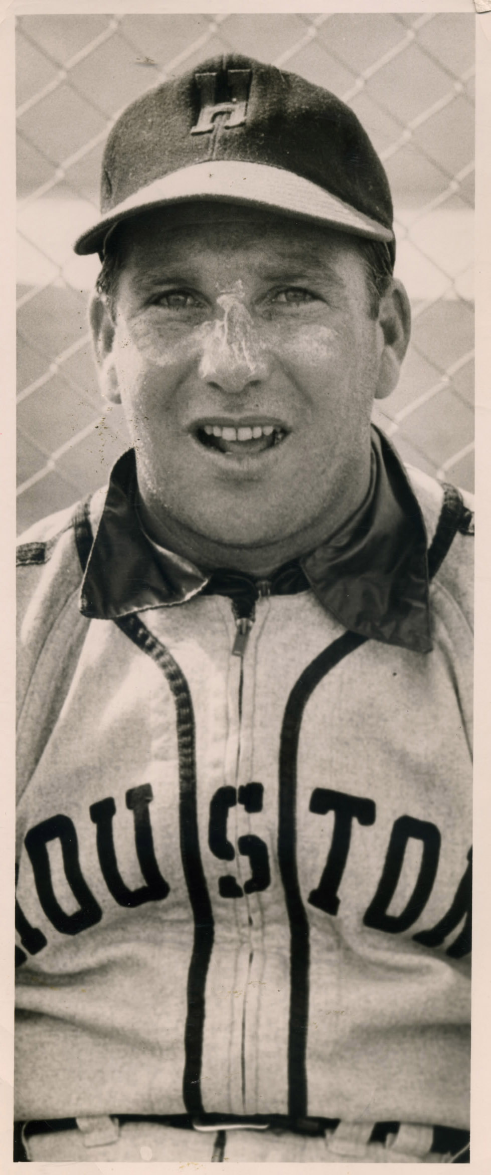 Houston Astros Authentication Specialist Mike Acosta was our featured speaker on SABR Saturday. Mike came with four of the new uniform models and a lot of information on how he and the club worked to get the club back to its early roots in orange and dark blue. With some adjustments, the uniforms, the lettering, and the decorative torso piping go way back to the early 1960’s – and perhaps, even further, if you care to compare the new “Houston” lettered grey jersey in the second (above) uniform color photo shown here with the black and white “Houston” grey road uniform of shortstop Billy Costa in the old 1952 Houston Buffs minor league photo that follows. I happened to have had this photo with me yesterday in a scrapbook of several we are considering for our major book project, but one of our members found it and spotted the similarity to its 2013 counterpart only after Mike Acosta had departed.