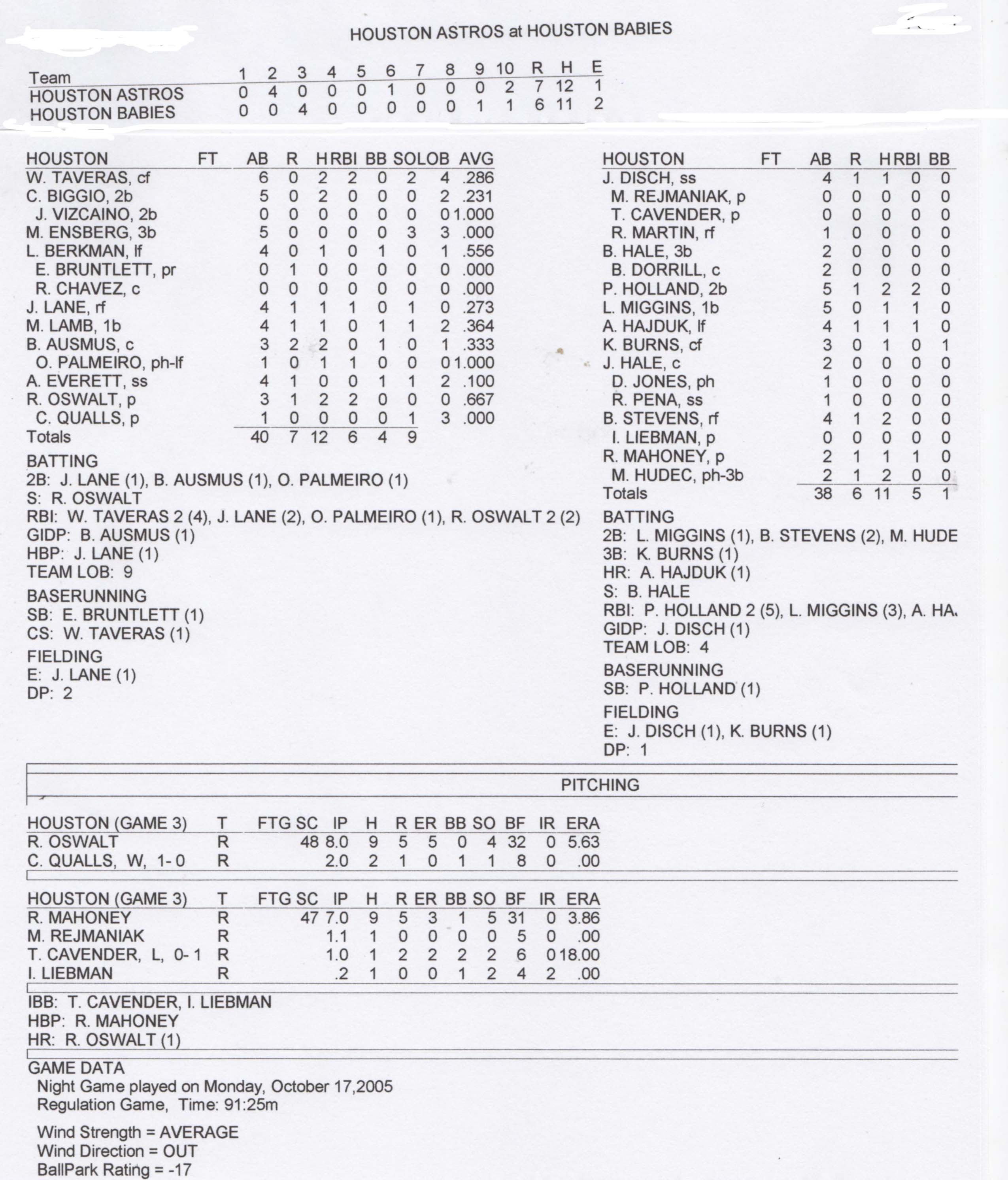 Taveras, Biggio, Ausmus, and Oswalt all had 2 hits each for the Astros in Game Three; Holland and Stevens had 2 each for the Babies. Chad Qualls (1-0) got the Astros win; Tony Cavender (0-1) took the Babies loss.