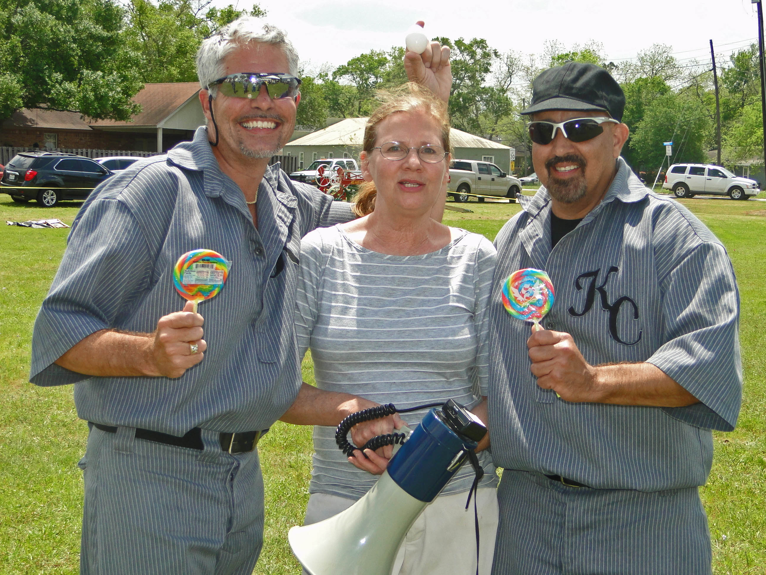 Nancy of the Sealy Group awards the Lollipops that went to the winners of the Egg Tossing Contest as Clay Merritt (L) holds the winning egg over her head and Dave Flores looks on in pleasure.