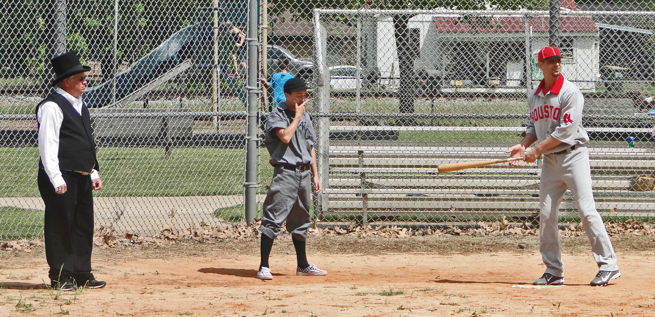 The bluebonnet trail to Sealy yesterday didn’t exactly play out as this photo suggests, but it may have done so for somebody else at some point along the road. We never give up on the complete dream of a little baseball paradise unfolding as it always does from the back burners of our fertile minds and 24’7 devotion to the spirit of the game that is baseball – and especially vintage baseball. Yesterday the Houston Babies and the Katy Combine were guest participants in the Sealy, Texas Spring Festival at the a park near the city’s downtown area on a bright and shiny and windy spring day.
