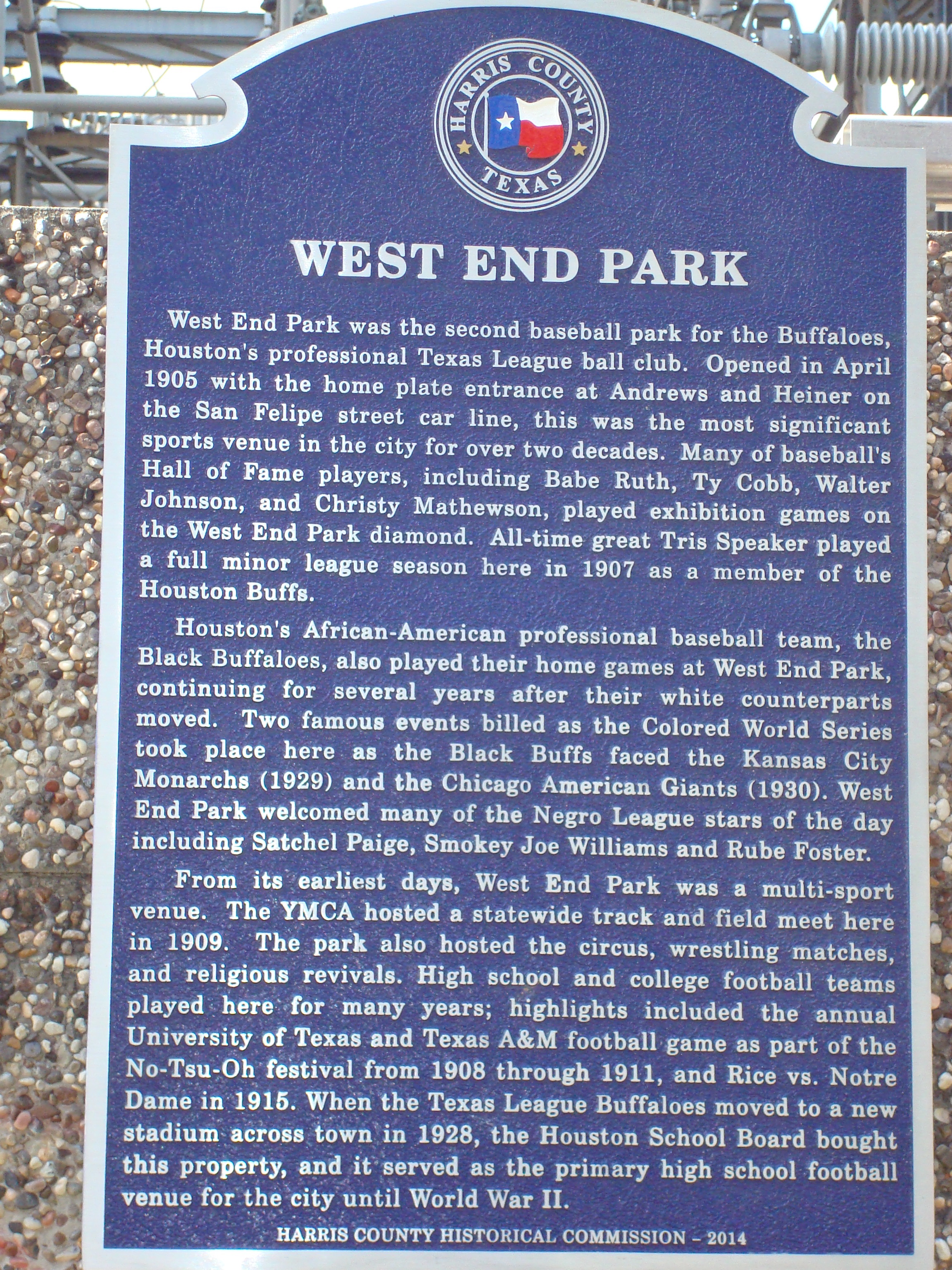 On a bright sunny morning some 35 baseball fans travelled back through time to Antioch Park at Allen Center at the corner of Smith and Clay in downtown Houston to celebrate the unveiling of a marker commemorating West End Park, a ballpark that hosted Texas League baseball in Houston from 1905 to 1927 and used for multiple other activities, including professional black baseball, until 1942.