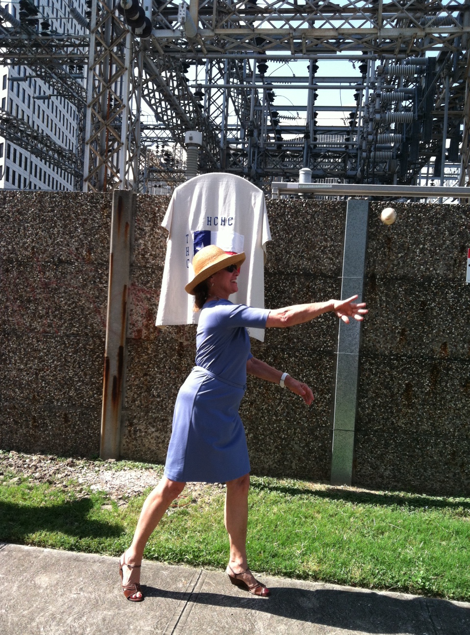 Minnette Boesel, who represented the Mayor of Houston, Annise Parker, throws a commerotive first pitch to Mike Vance at the site of the plaque. (Photo by Mike McCroskey).