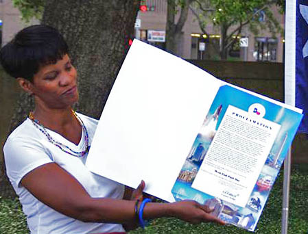 Debra Sloan of the Harris County Historical Commission displays the City of Houston Proclamation that July 12, 2014 has been dubbed as “West End Park Day” in Houston. ~ (Photo by Matt Rejmaniak).