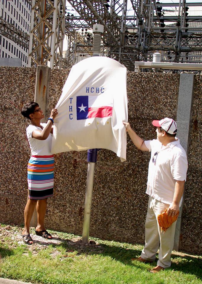 The marker, actually located a block from Antioch Park on Andrews, was sponsored by CenterPoint Energy. It was unveiled by Mike Vance, president and executive director of Houston Arts and Media, and Debra Sloan, Marker Dedication Chair of the Harris County Historical Commission. First pitch honors went to Minnette Boesel who represented Houston Mayor Annise Parker with Mr. Vance doing the catching duties.