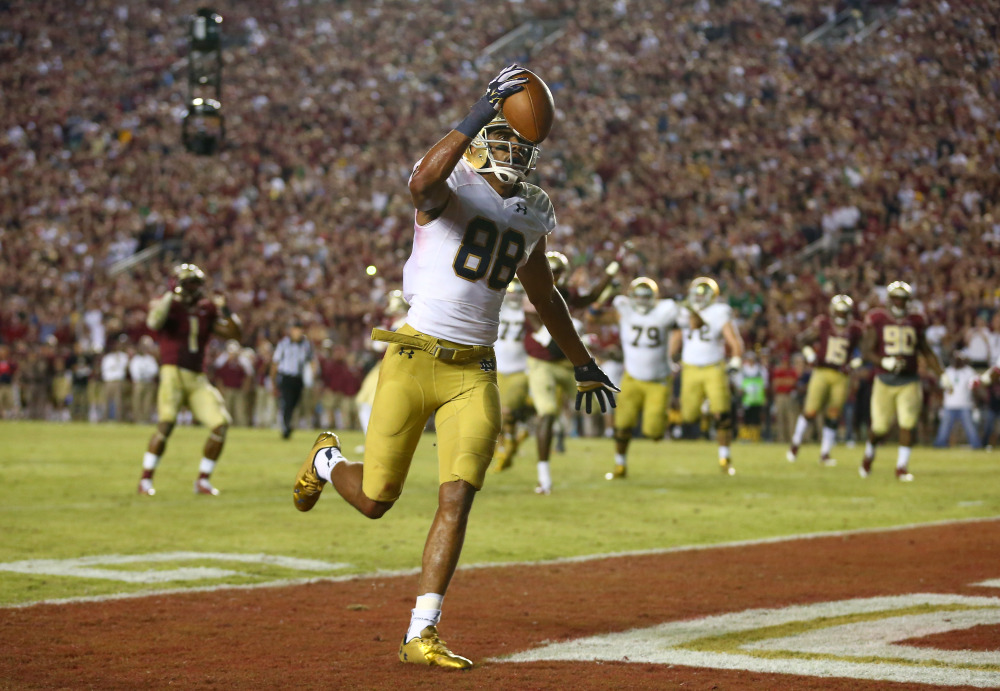 Corey Robinson score what could have been the winning TD for Notre Dame against Florida State, but it was called by a confusing offensive pass interference call with seconds to go. As a result, #2 FSU defeated #5 ND, 31-27.