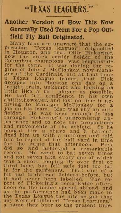 McCloskey picked up Pickering on the spot. He had him cleaned up with a shave and a haircut and provided him with a uniform – and then told him to show up at the ballpark for the game scheduled for that afternoon. Pickering showed up, all right. He went to bat seven times and, each time he did, he softly stroked a looping, dink fly ball  beyond the first base side infielders that then landed before the right fielder could keep it from touching the ground – or else – he hit the same kind of lazy looper just beyond the reach of the third base side infielders that also touched down before the left fielder could catch it. – News of Pickering’s feat spread rapidly to the rest of the country and, because these easy to spot soft sailing singles all look so much alike, and because they took place every time in Pickering’s  seven-single Texas League game in Houston, these seven dwarf hits, and all of the thousands that have since followed them off all the bats of countless others, have became best known forever from that day as “Texas Leaguers”.