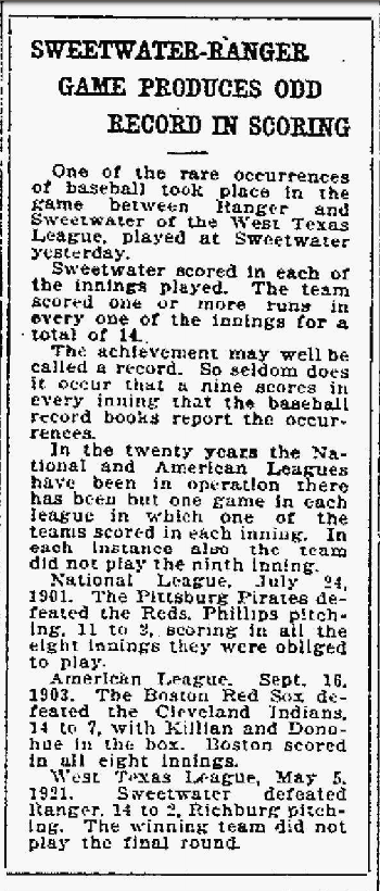 The Pecan Park Eagle has no immediate update data on how often the “team scores in every inning of the game” phenomenon that Sweetwater pulled off against Ranger in 1921 has been repeated in the past 95 years, but it is just interesting always to note that the baseball community’s interest in noting and recording the most arcane of statistical accomplishments apparently has been around forever. This May 6. 1921 report even notes their sense of awe over the fact this same accomplishment has occurred through this early date in modern history only once in the American and National Leagues in their first two decades of post-season competition with each other.