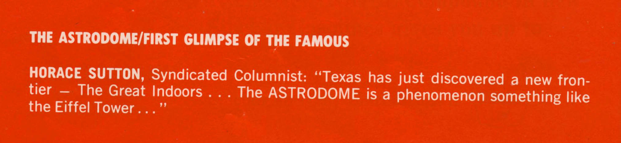 HORACE SUTTON, Syndicated Columnist: “Texas has just discovered a new frontier – The Great Indoors … The ASTRODOME is a phenomenon something like the Eiffel Tower …”