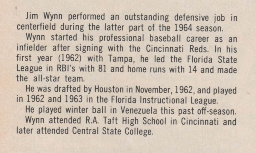 Jimmy Wynn’s early descriptions in the 1965 first Astrodome expanded program magazine were pretty much the kinds of demographic material we expect to get on young, as of yet, unproven, but promising prospects.