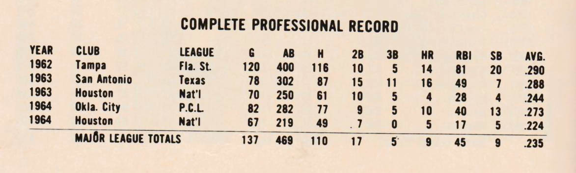 Jimmy Wynn’s MLB career stats going into the opening of the Astrodome in 1965 included only limited action with Houston from 1964. In case you’ve forgotten, here’s a link to all the homers that followed ver the curse of his total MLB career: