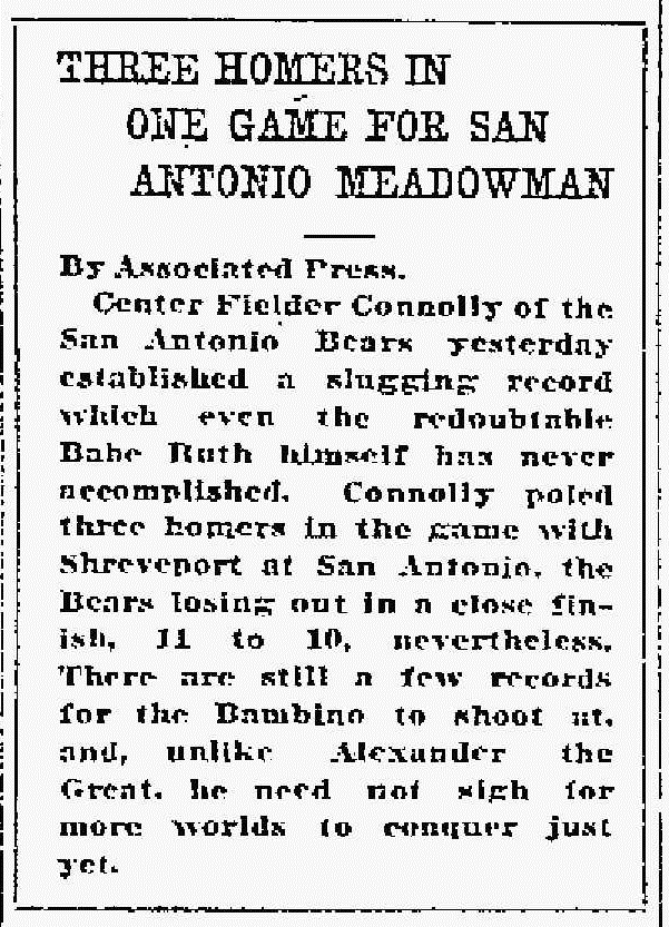 On June 19, 1921, The Galveston Daily News reported the following on San Antonio’s Joe Connolly and his 3-HR Texas League game:
