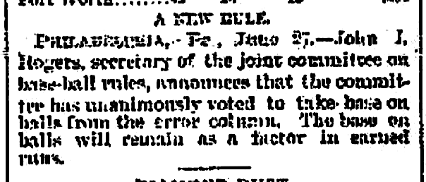 Philadelphia, Pa., June 27. – John J. Rogers, secretary pf the tthe joint committee on base-ball rules, announces that the committee has unanimously voted to take base on balls from the error column. The base on balls will remain as a factor in earned runs.