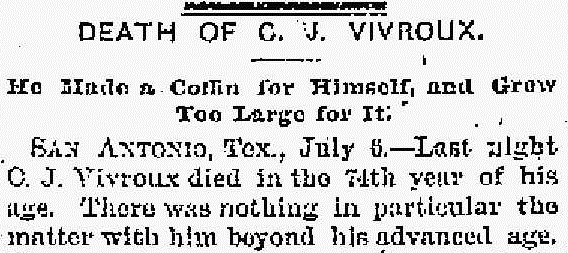 San Antonio, Tex., July 6. — Last night C.J. Vivroux died in the 74th year of his age. There was nothing in particular the matter with him beyond his advanced age. He was a Frenchman by birth and a locksmith by trade, and was universally respected. For a long time he ran a shop on Navarro street, and did a thriving business. Eighteen years ago he made himself a coffin of iron. It stood in his working place in view of all visitors. He was proud of its workmanship, its shape, the elegant manner in which it fit him and its other merits. He realized a very handsome competency, and retired from business taking his future abode with him. Up to the moment of his death it was a cherished piece of furniture in his bedchamber. He never lost faith in it, and his admiration of it never abated a jot. Unfortunately, like most of his nation he lived well and during his retirement took on much flesh. When the attendants attempted to place him in the “narrow house” which his hands had fashioned so many years ago it was found that he had outgrown it. All efforts were unavailing, and C.J. Vivroux was buried in a custom made coffin after all.