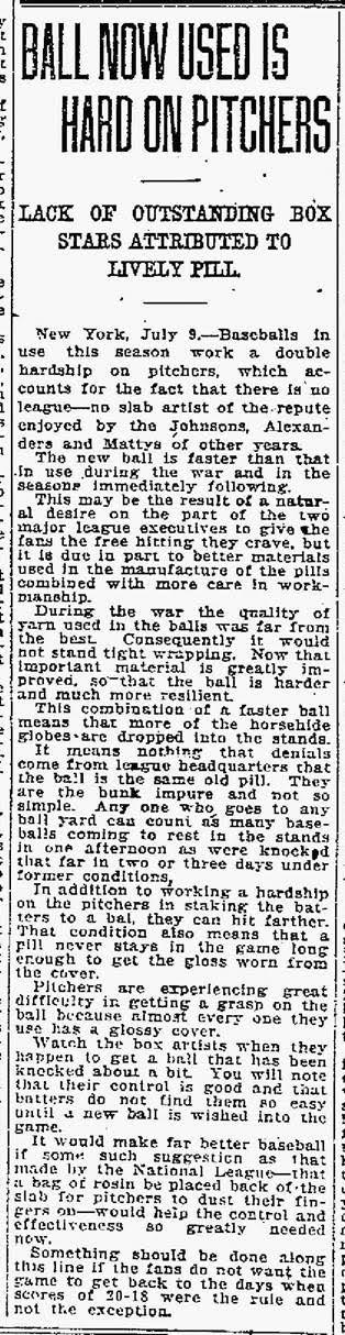 Hope you can read these two articles from 1921. They fail to cover the biggest reason why MLB was happy to look the other way from straight answers about the new lively ball, as they often do on things that seem to help fill the gate, whether its legal or ethical, etc., as long as the game is putting butts in the seats of their ballparks, they denied that there was such a thing a new lively ball. Home runs were a crowd pleaser, as Babe Ruth and Company did their part in helping baseball move hard, fast and away for the 1919 Black Sox Scandal as quickly as possible.