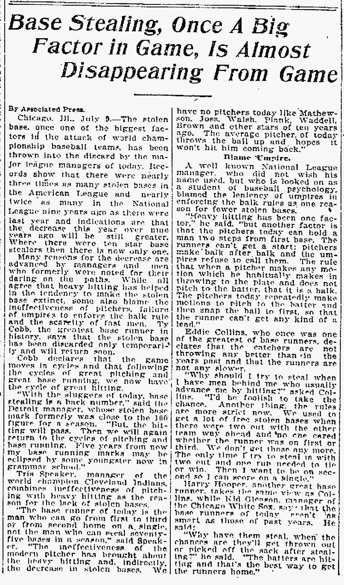 Like the Chicken Littles of 1930 who fretted over the super lively ball that ballooned offensive stats that year, and later, those of 1968 who seemed to curse the death of all offense, some writers of the early 1920s also were having trouble with changes in the game that seemed to be killing baseball as they felt it should always be played – one with dominant itching, defense, low scoring, and a lot of strategic base running.