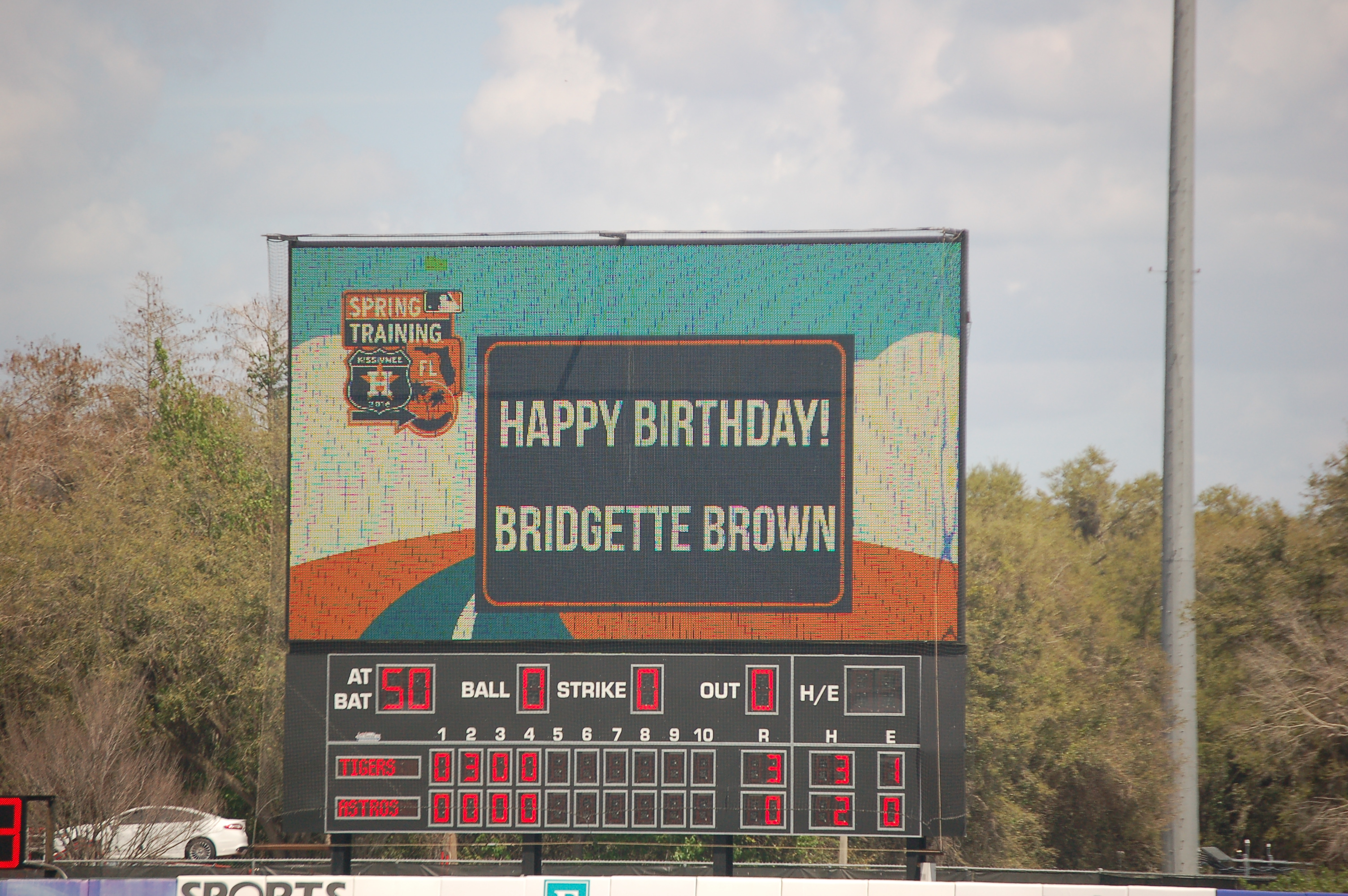 A birthday surprise greeting for Bridgett Brown did hit the screen, but the Astros misspelled her name. – We think it may have been the first recorded error in Astros History.