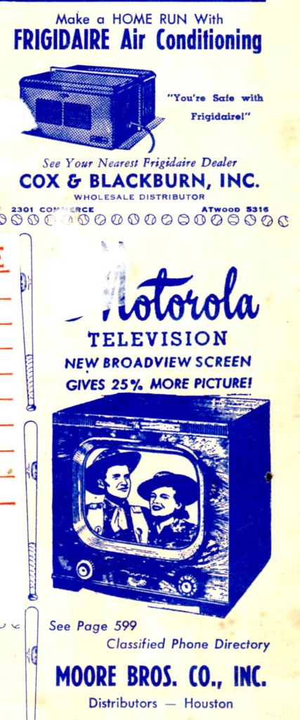 For a lot people in 1950, you were either from Houston – or just passing through because your corporate oil patch company “boss of your life” had sent you here to do whatever it was you did that was of value to them. And that was OK, sort of, if you came from the South – or other parts of Texas where it’s also hot as blazes during the summer – but that wasn’t so true when it came to the carrot and stick problem that companies had sending many people to Houston back in 1950. There was nothing “cool” about living in Houston to valued corporate workers from milder, more sophisticated climates, at all. And that’s what’s so cool about these two adjoining ads in the 1950 scorecard. Air conditioning and television were poised to sweep through Houston like a decade-long “norther” of social change. Houston was on its way to becoming cool in all the ways that count – and that includes the assault that has taken place upon the ignorant and totally uncool hand of segregation and racism – a quieter battle that continues to this day.