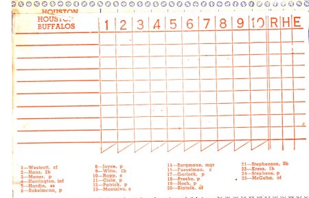 Today it turned out to be this four-pages-in-all cardboard scorecard from the 1950 Houston Buff Texas League baseball season. 1950 was hardly a memorable year for the Houston Buffs. The team stank, finishing 8th and cellar-last at 61-93 – a full two games back of the 7th place Shreveport Sports – and 30.5 games back of the first place Beaumont Roughnecks and their two future MLB stars, infielder Gil McDougald and catcher Clint Courtney. And, oh yeah, the great and strange Rogers Hornsby was the manager of our little brother city to the east’s whip-ass ball club too, a fact that galled the bloody bejabbers out of our Cardinals-proud Houston fans.
