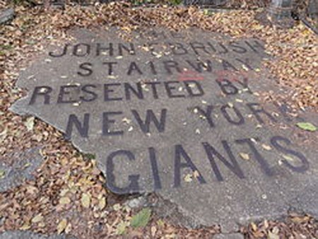 When the John T. Brush, the owner of the New York Giants, died in 1912, the club wanted to memorialize his importance to the successful foundation of National League baseball in Harlem. So they chose a most practical way to do it. From the high above street level approach on Coogan’s Bluff to the down below Polo Grounds, the Giants built a sturdy and useful stairway from the street, down the slope, all the way from the famous Coogan’s Bluff to the even more renowned venue that we shall remember forever as the Polo Grounds – the iconic home of so many major moments, but certainly none bigger than Bobby Thomson’s 1951 “Shot Heard ‘Round the World” – or “The Catch” by Willie Mays in the 1954 World Series.
