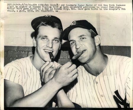 Roger Maris was celebrating the birth of his son in this 1960 photo. – Bob Cerv was celebrating the birth of his eighth child, a girl, at the same time. – Looks like Bob Cerv carried the heavy lumber in the baby breeding arena, even if he doesn’t get an asterisk beside the number on his final total.